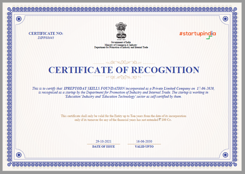 "This is to certify IPREPTODAY SKILLS FOUNDATION incorporated as a private limited company, is recognized as a startup by the department for promotion of Industry and internal trade. The startup is working in "Education Industry and Education Technology sector."