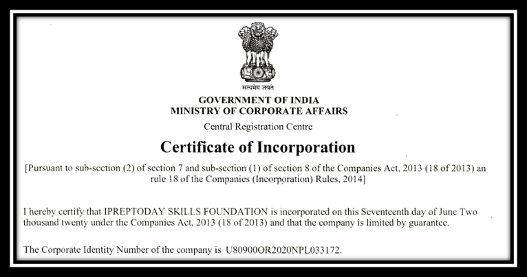 "Ipreptoday Skills Foundation is a Private incorporated on 17 June 2020. It is classified as Non-govt company and is registered at Registrar of Companies, Cuttack. . Ipreptoday Skills Foundation's Corporate Identification Number is (CIN) U80900OR2020NPL033172 and its registration number is 33172."